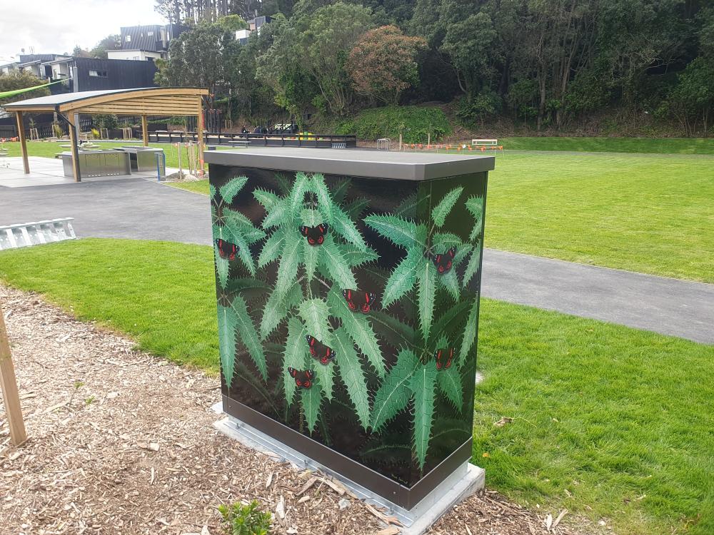 In 2025 I had the privilege of being commissioned by the Wellington City Council to not only install a kaleidoscope of my Red Admirals in the new public park in Owen Street, Newtown, but also create 2 murals and the designs for 2 power boxes. I worked with a group of 8-10 year old students from Newtown School to design and paint aspects of the artworks capturing the lifecycle of one of New Zealand's most beautiful native butterflies, the Kahukura Red Admiral. Here's one of the power boxes at the entrance to the park where I've turned the box into an Onga onga plant which is the host plant for the Kahukura.